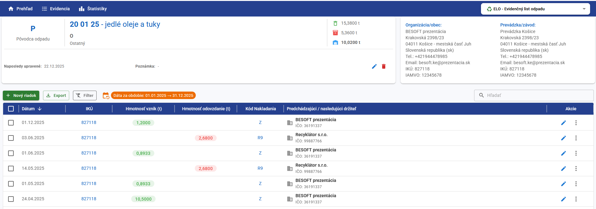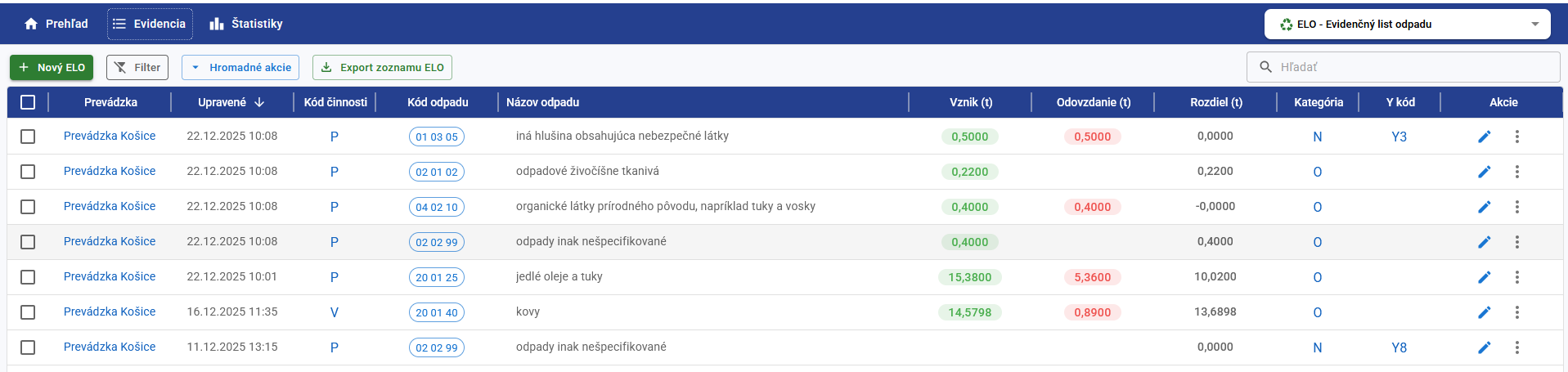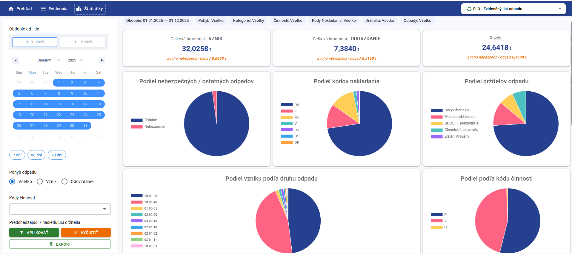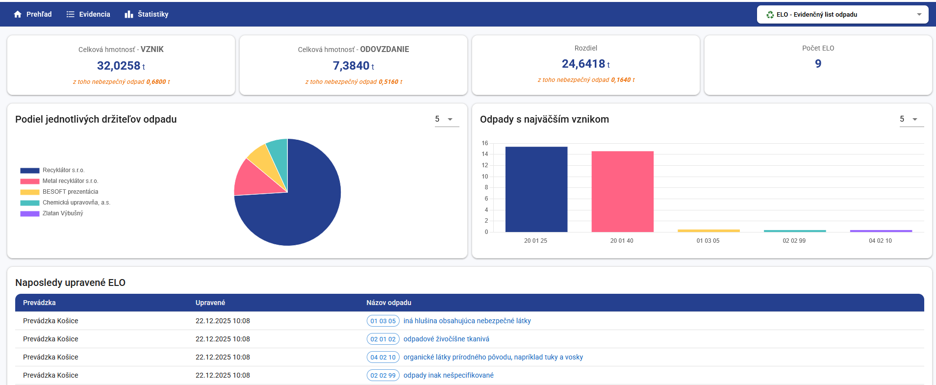 Máte okamžitý prehľad o celkovej hmotnosti vzniku a odovzdania odpadu, počte evidenčných listov odpadu (ELO) a podiele jednotlivých držiteľov. Interaktívne grafy zobrazujú odpady s najväčším vznikom a rozdelenie nebezpečných a ostatných odpadov.