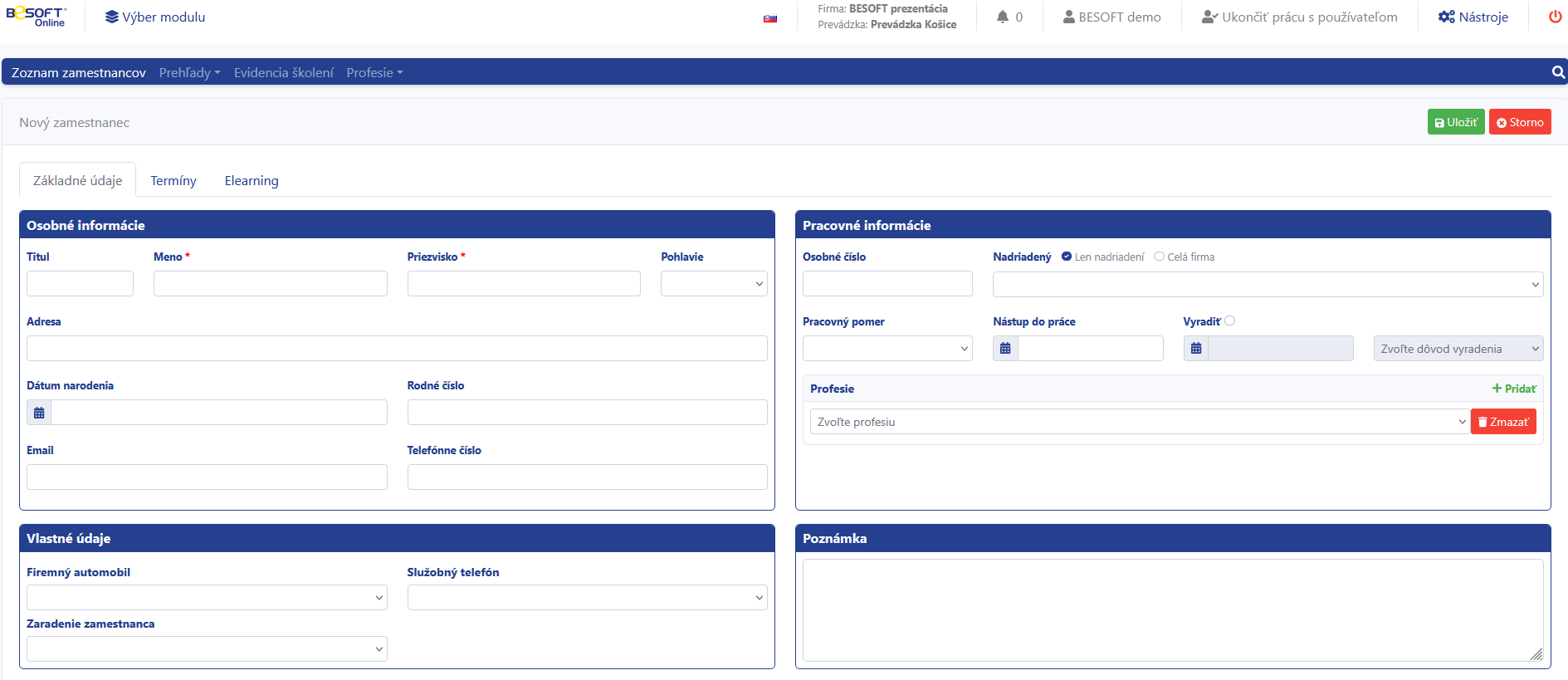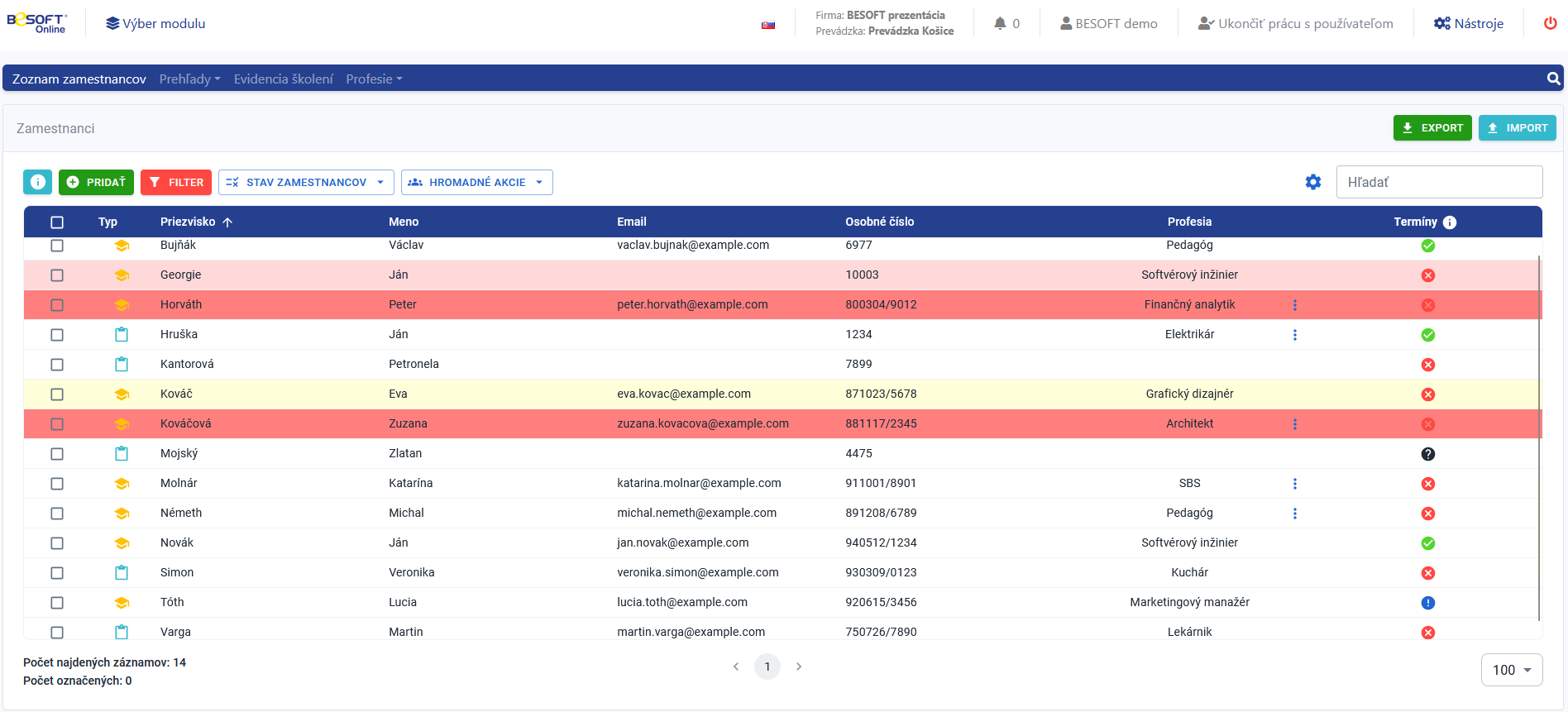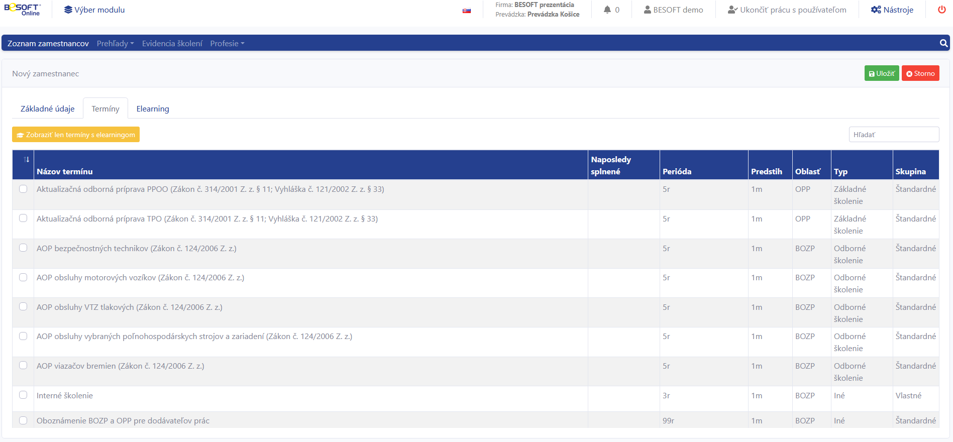 Modul Zamestnanci je určený na evidenciu zamestnancov spoločnosti a najmä na sledovanie k nim priradených termínov školení, lekárskych prehliadok a iných periodických povinností. Obsahuje zoznam predefinovaných legislatívnych termínov z oblasti BOZP a ochrany pred požiarmi, ktorý je neustále aktualizovaný.