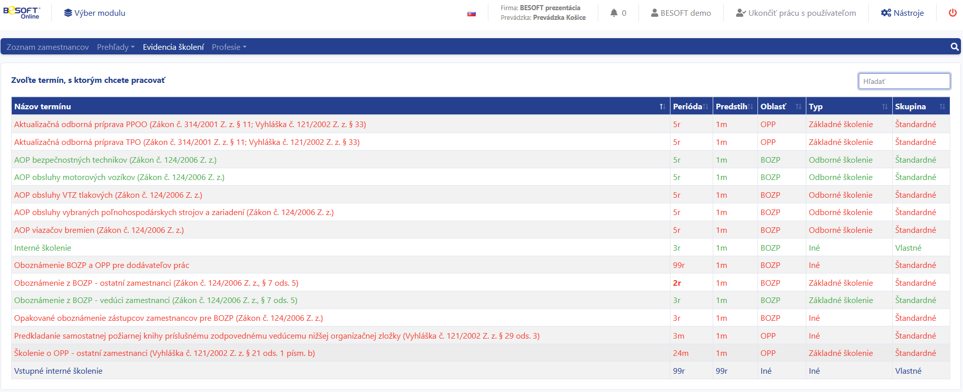 Modul tiež umožňuje vytvárať rôzne prehľady o nesplnených, absolvovaných alebo blížiacich sa školeniach, lekárskych prehliadkach a iných termínoch.